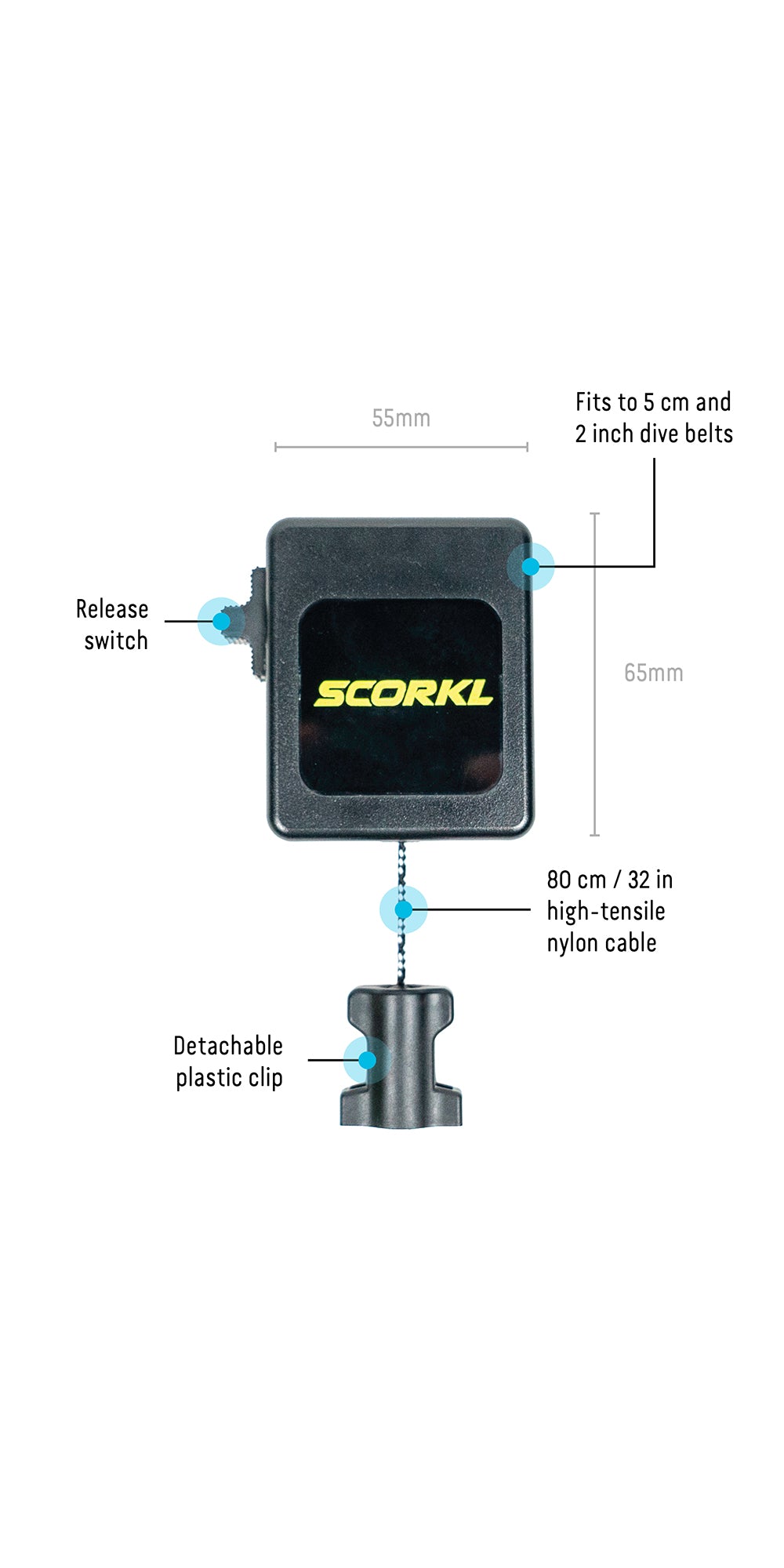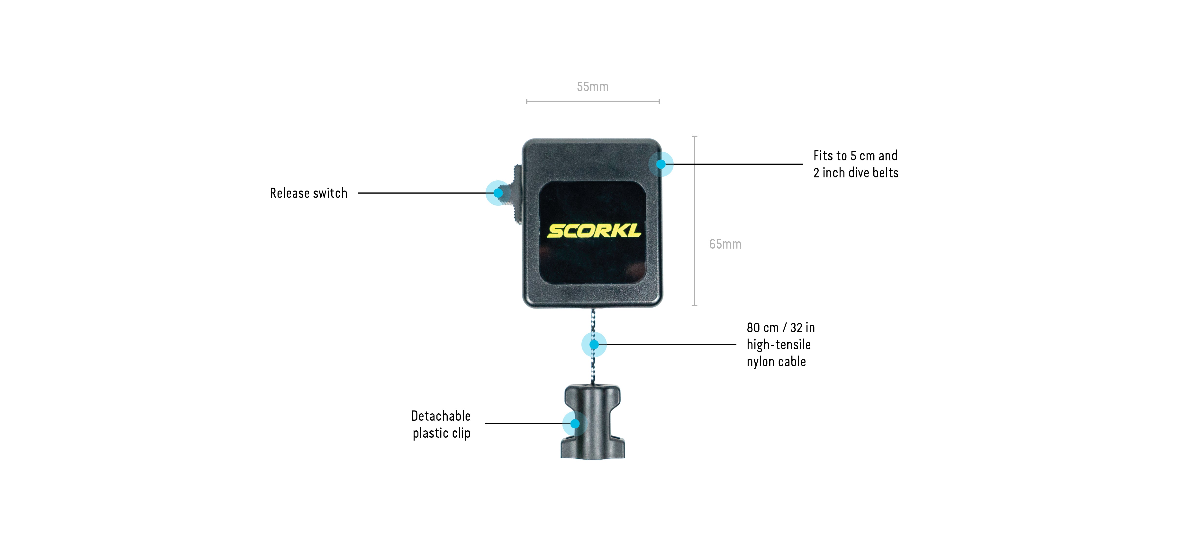 The locking mechanism holds the cable at any length (0-80cm/32in. The quick release clip allows the SCORKLer to quickly attach/detach the retractor from the SCORKL post-dive.