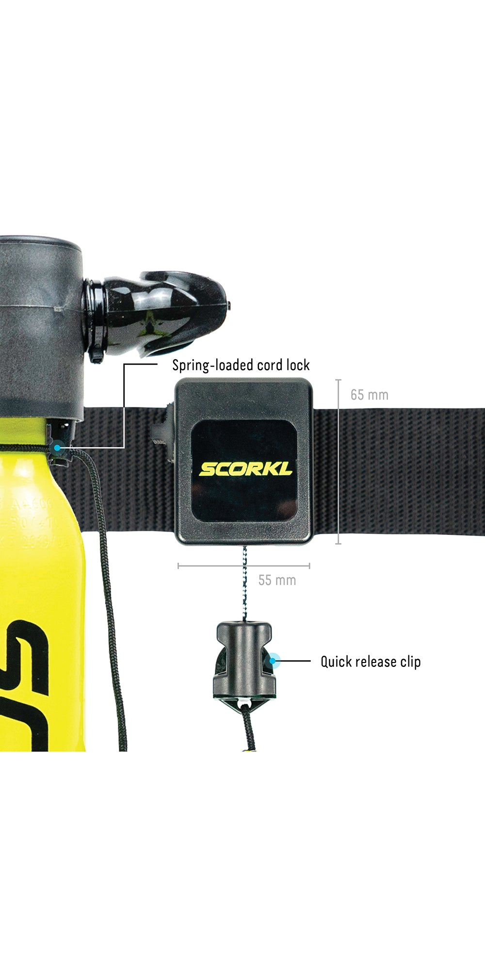 The SCORKL Retractor is spring-loaded to keep your equipment on hand. Attachable to a dive-belt or D-ring. The quick release clip loops around the neck of your SCORKL. When unlocked, the SCORKL will draw back to your belt or dive-vest.
