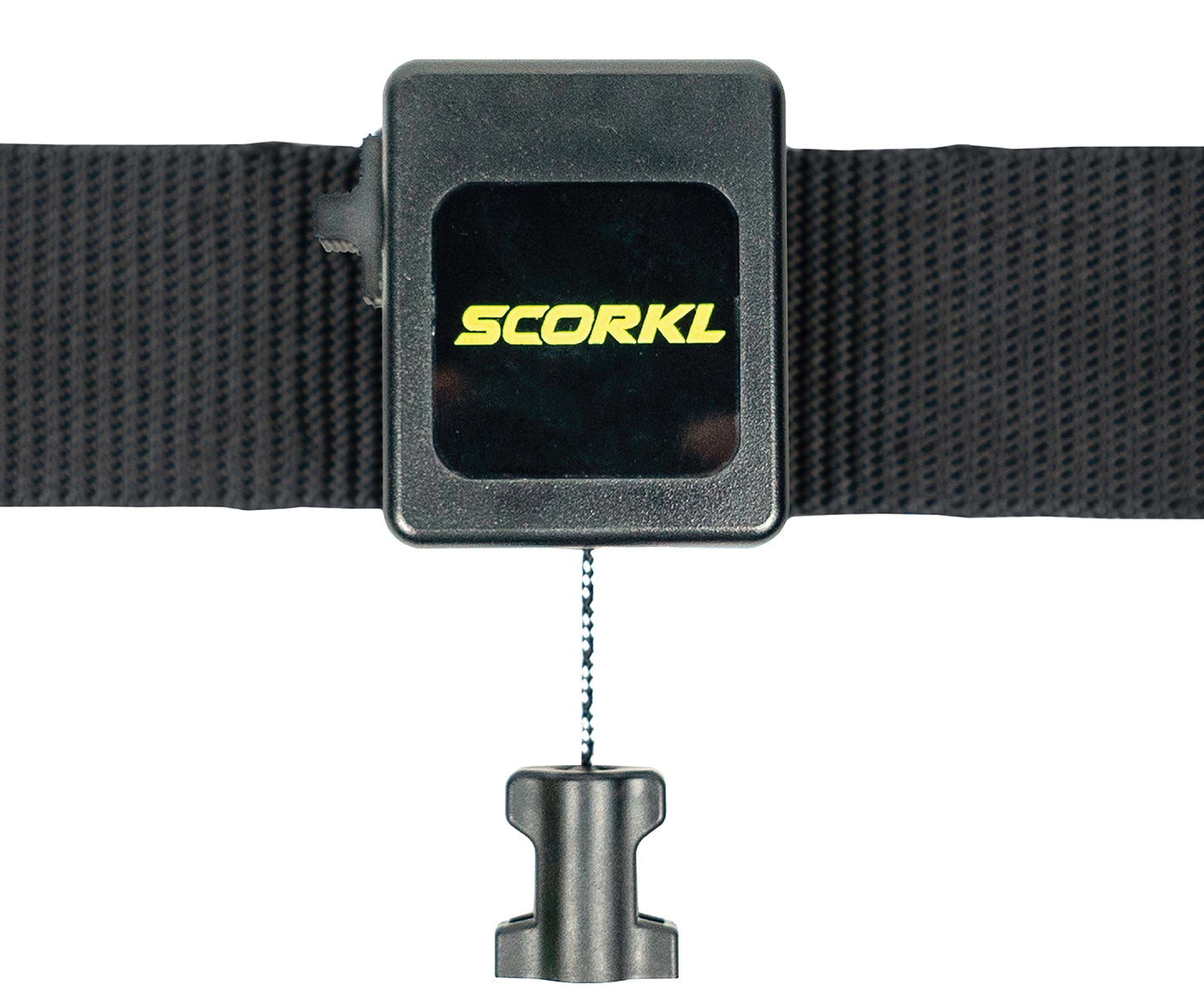 The SCORKL Retractor attaches to 2in/4cm dive belts and loops easily over the neck of your SCORKL or SCORKL Pro.