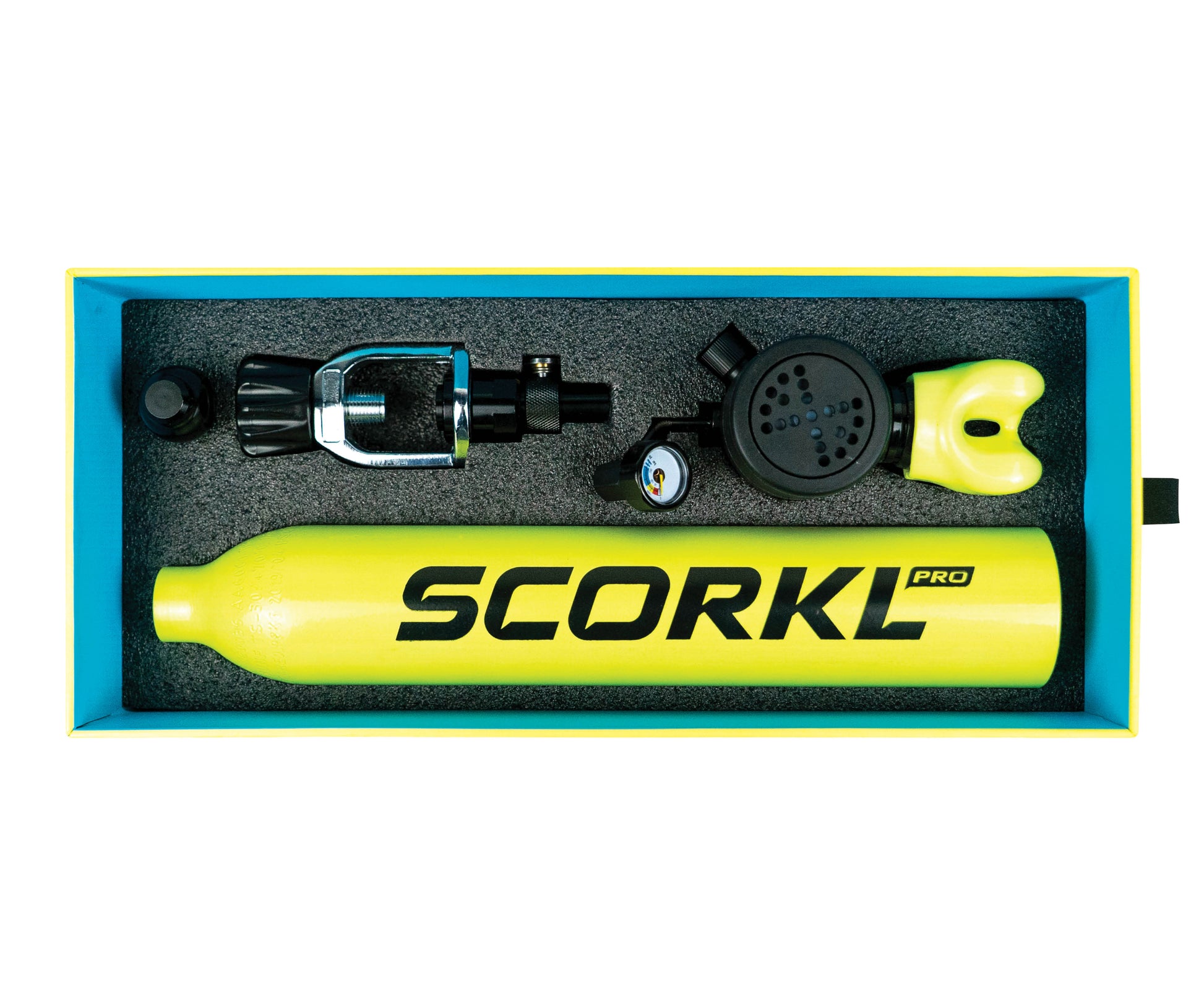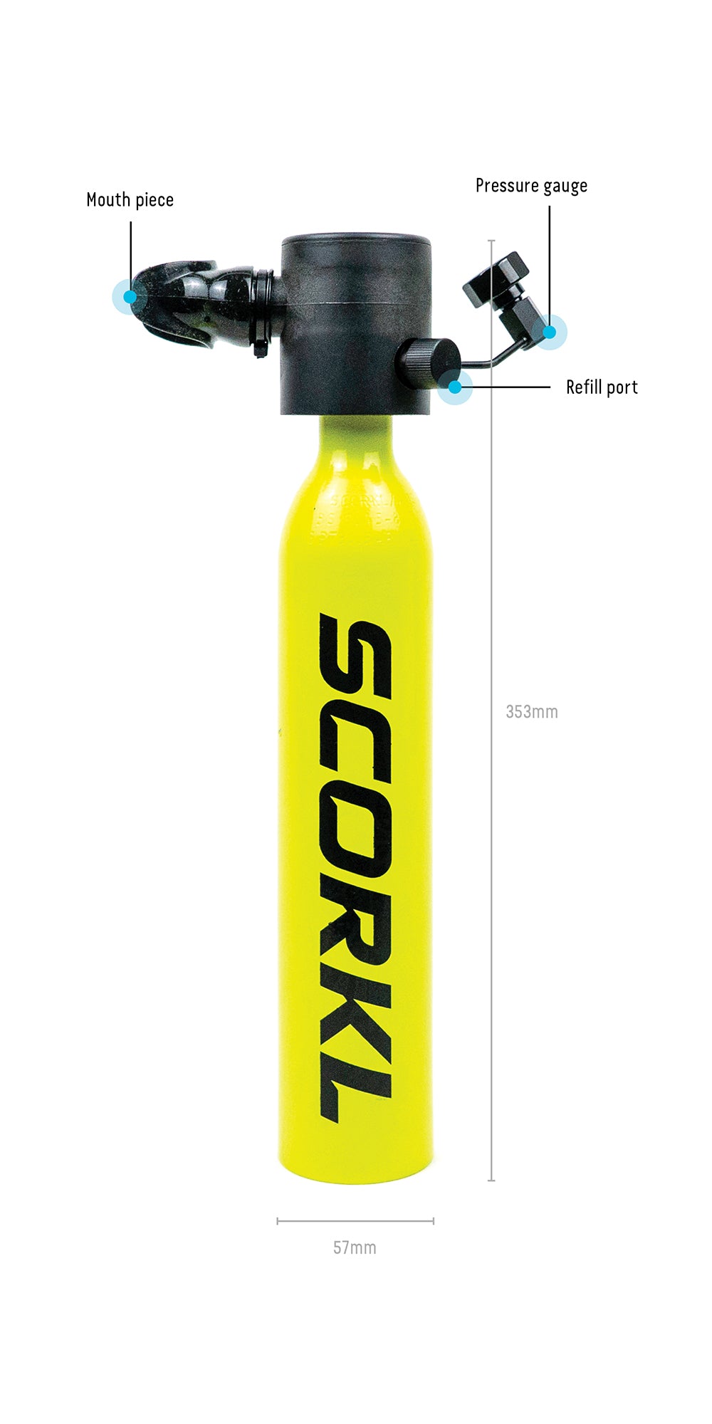 - Includes SCORKL PRO cylinder, regulator, SCUBA tank refill adapter, compressor refill adapter, protective dust caps, safety instructions and user guide.