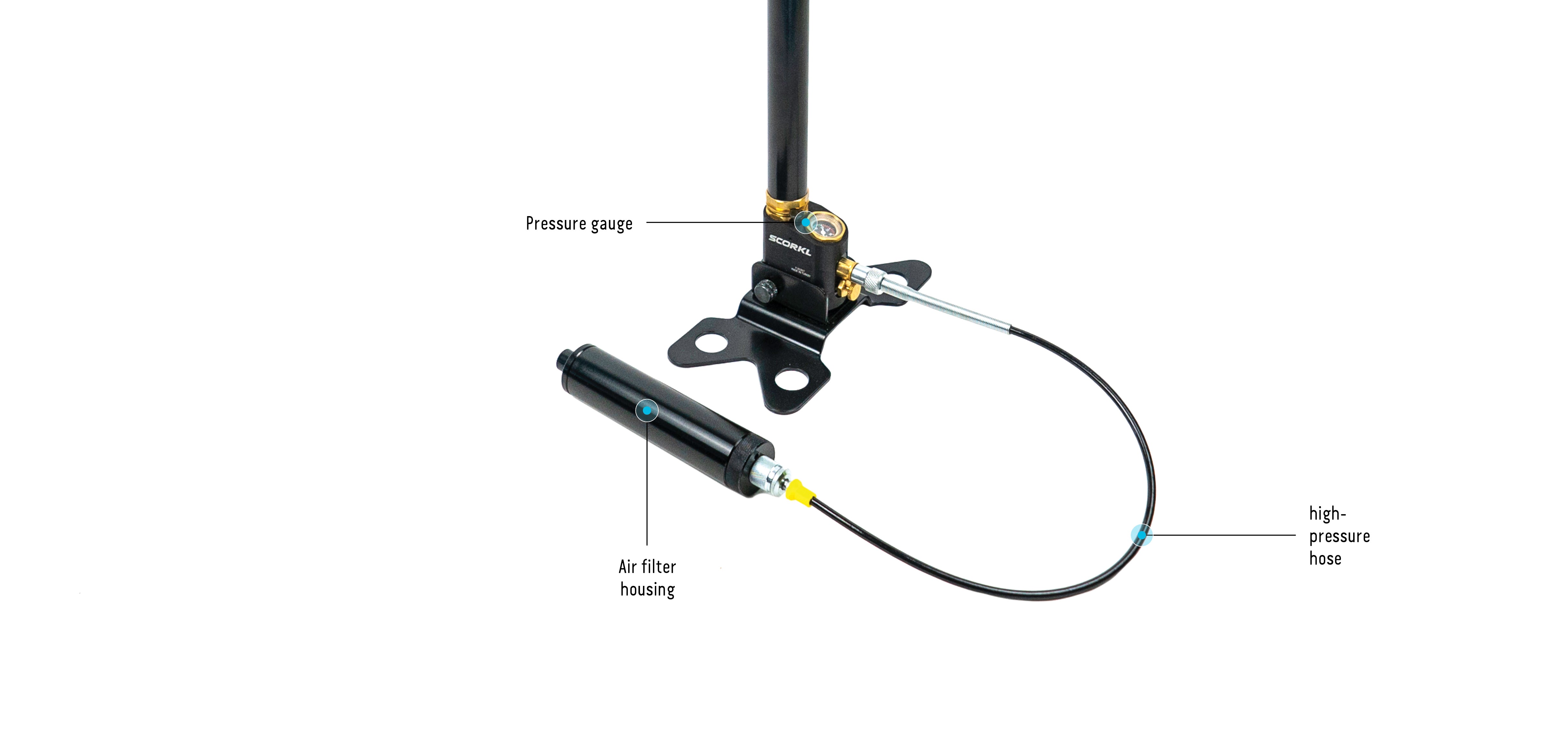 The air filter ensures Grade E scuba air quality. The SCORKL hand pump also includes a pressure gauge, a high-pressure hose and spare pump parts for servicing.