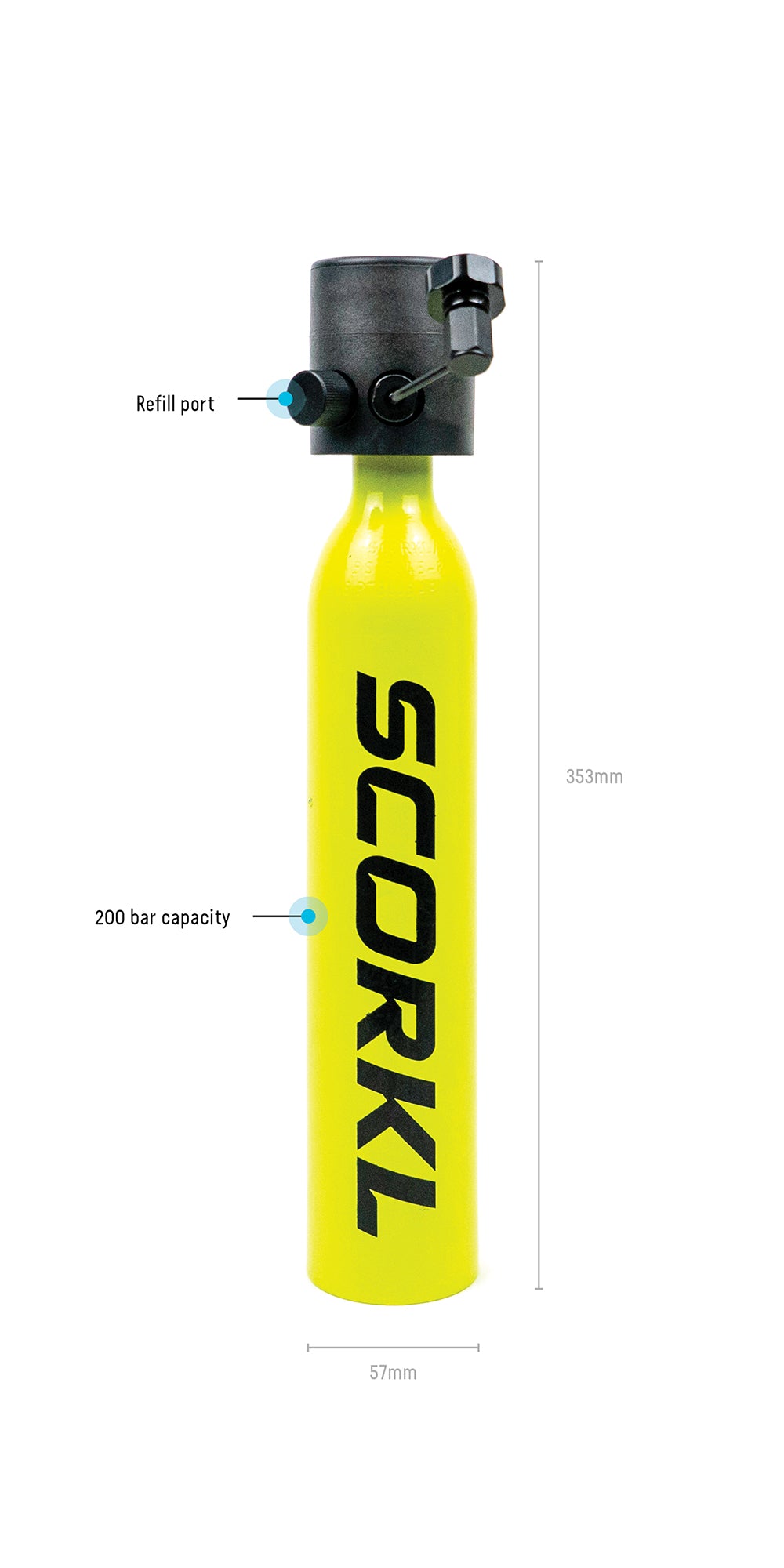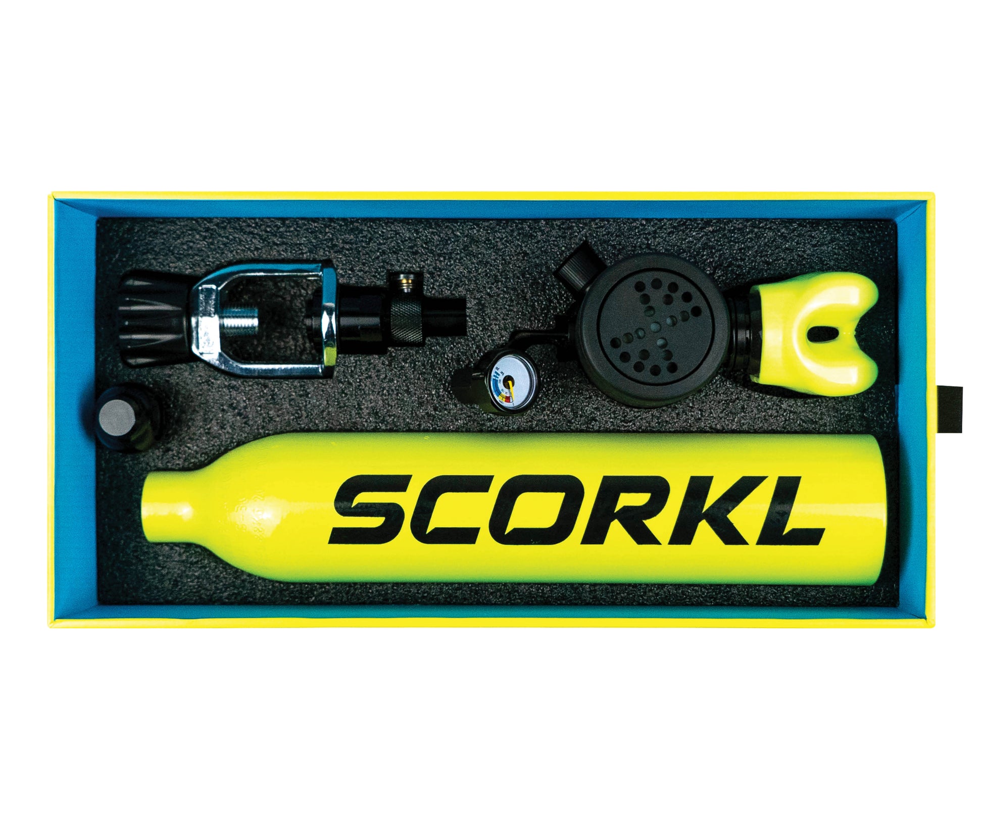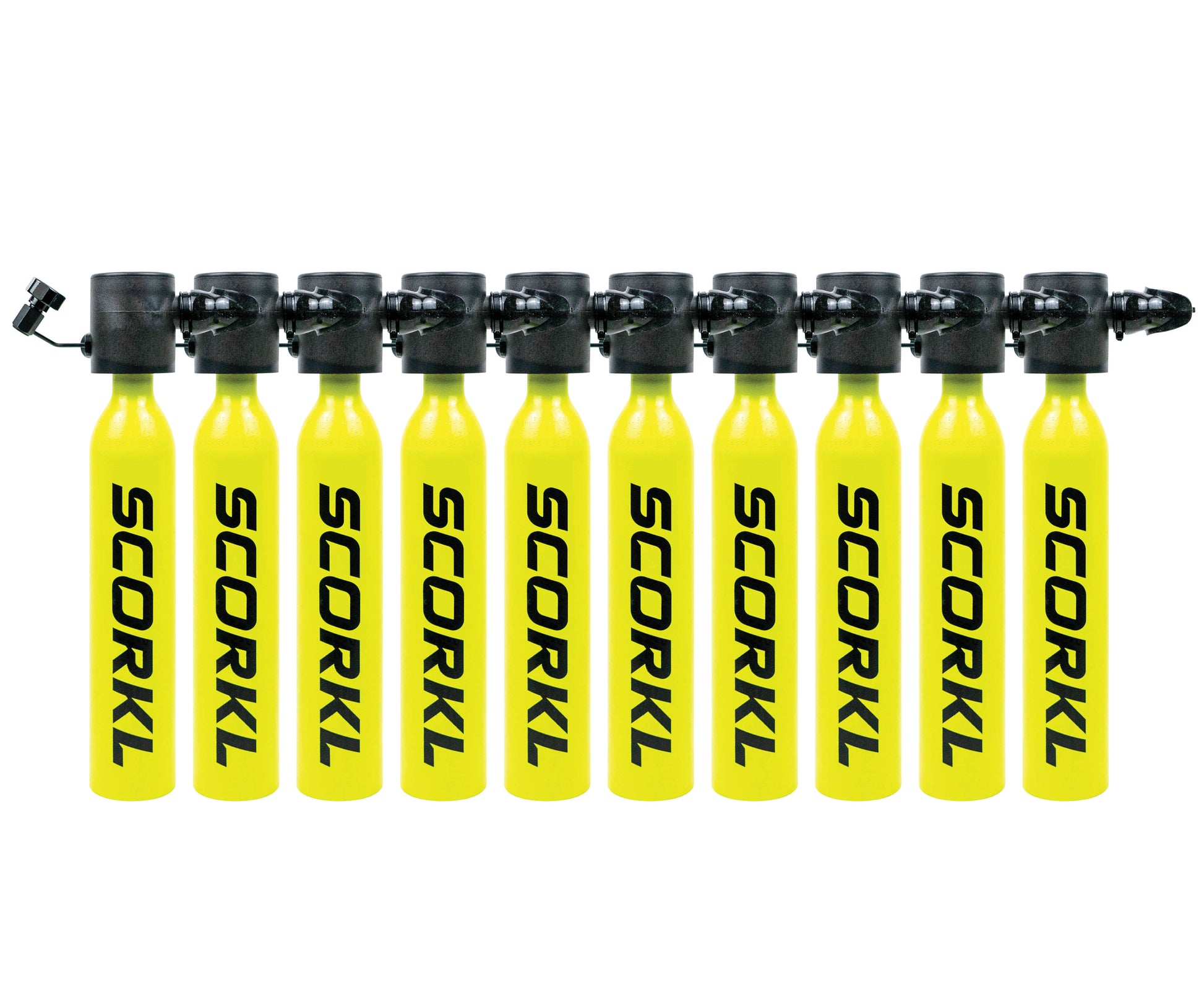 • Includes 10x SCORKL cylinders with regulators, SCUBA tank refill adapter, compressor refill adapter, protective dust caps, safety instructions and user guide.