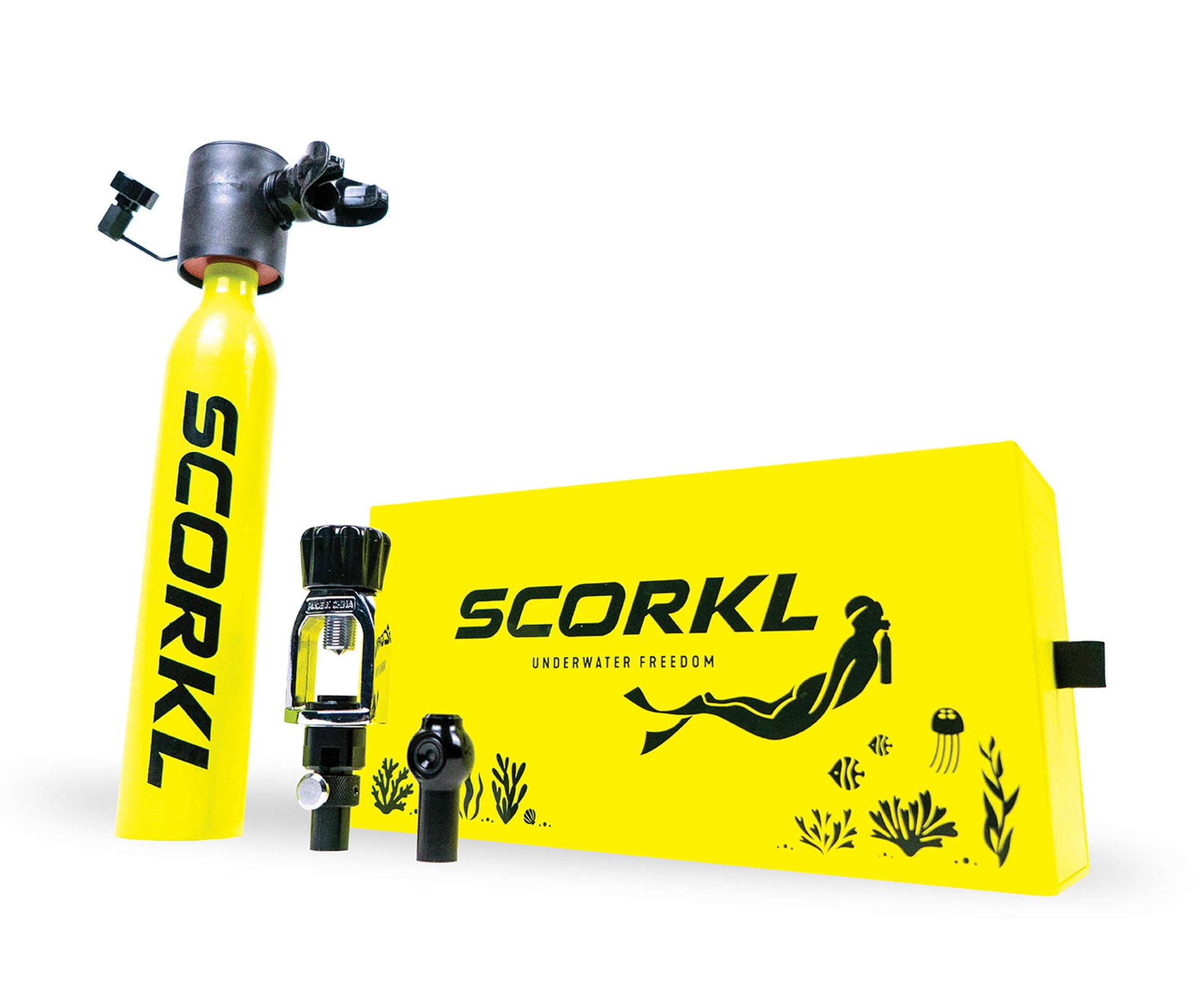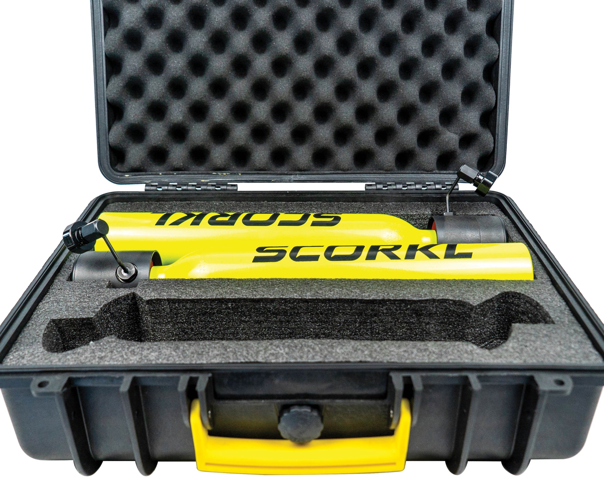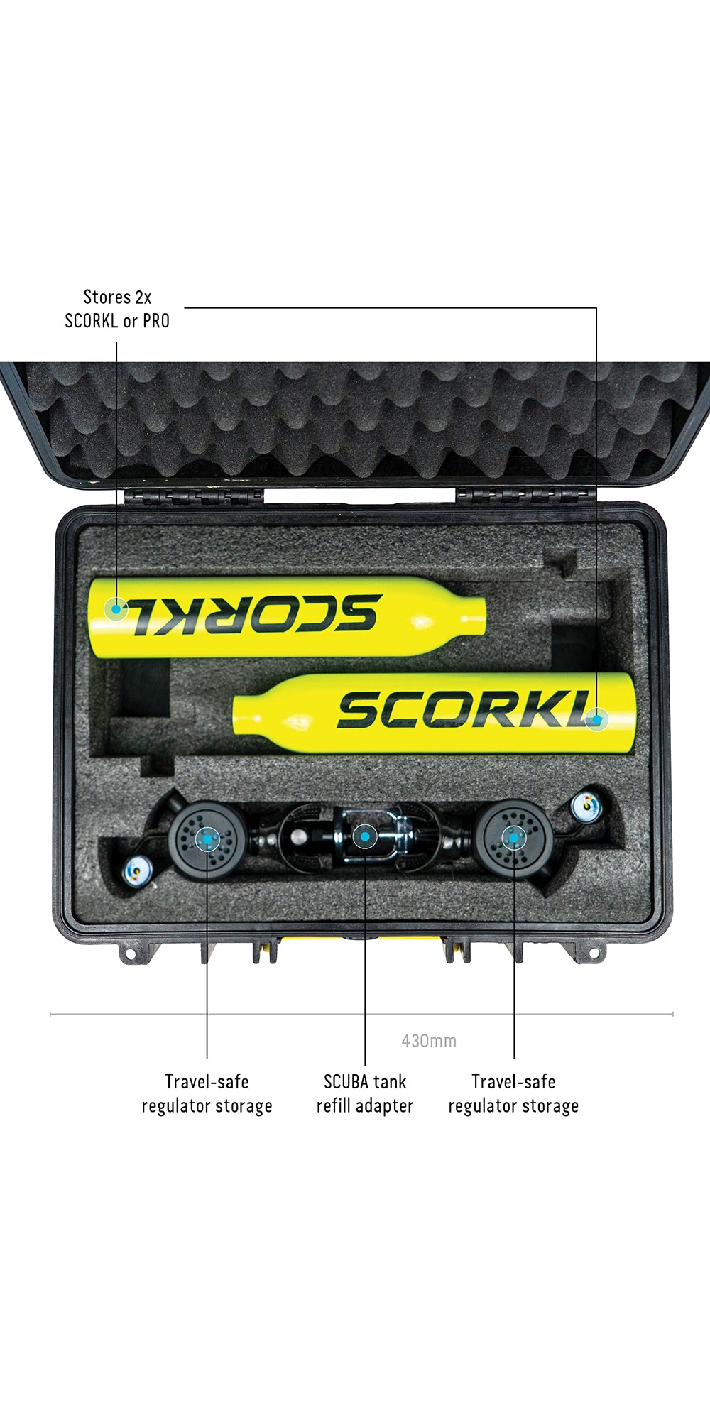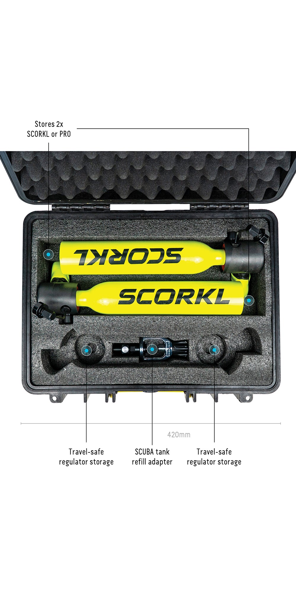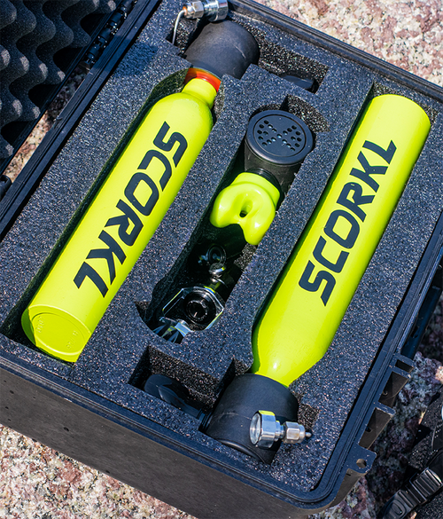 - Includes 2x SCORKL cylinders with regulator, compact case, SCUBA tank refill adapter, compressor refill adapter, protective dust caps, safety instructions and user guide