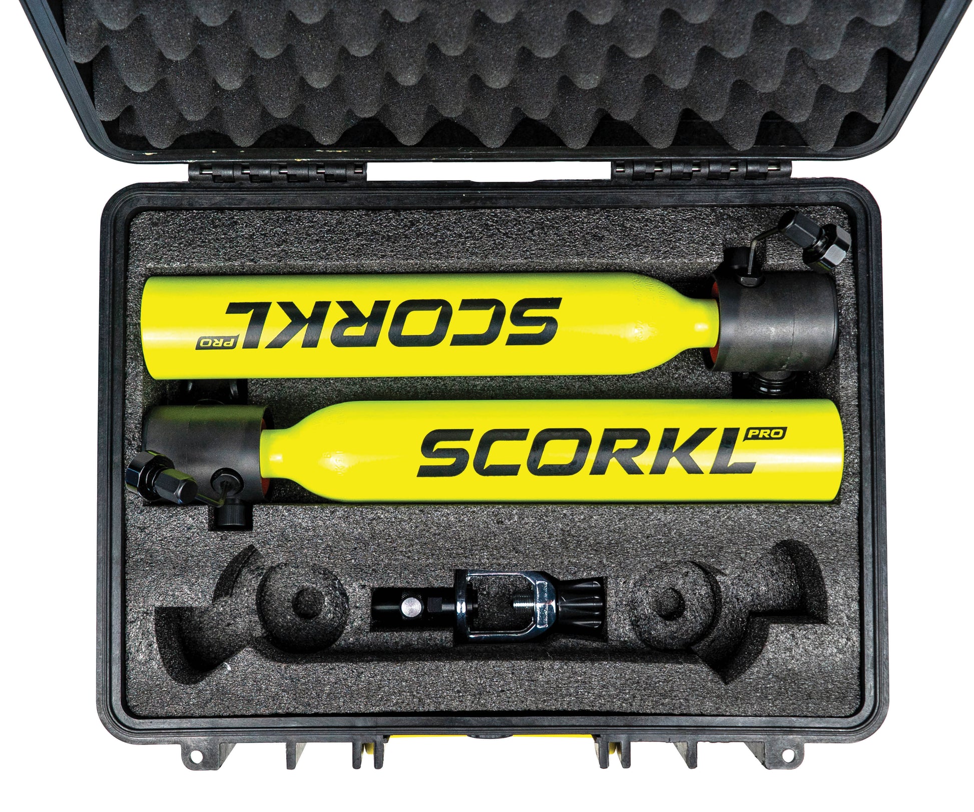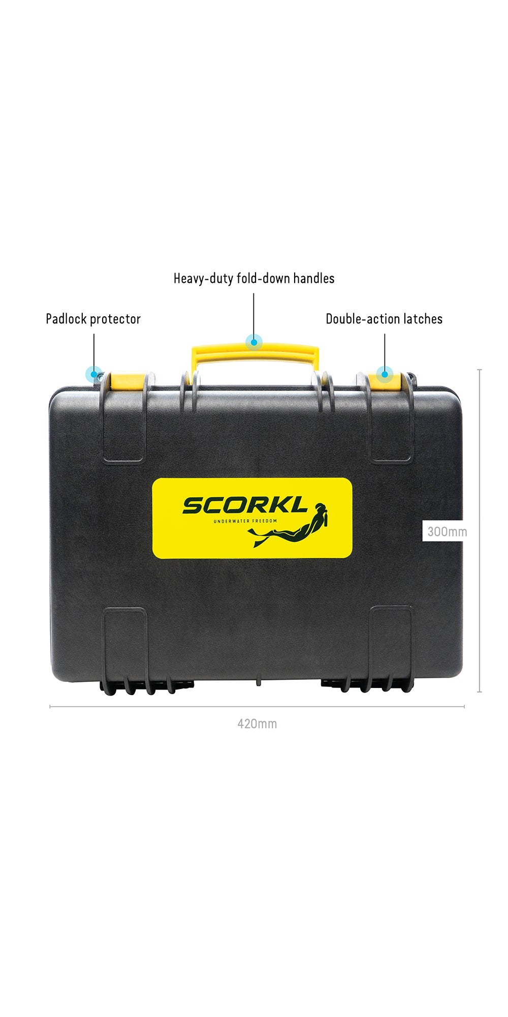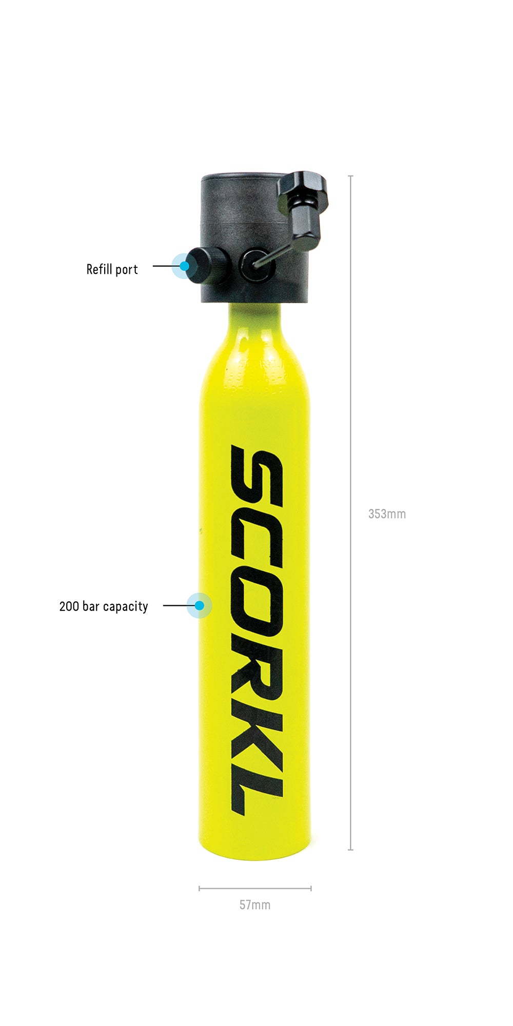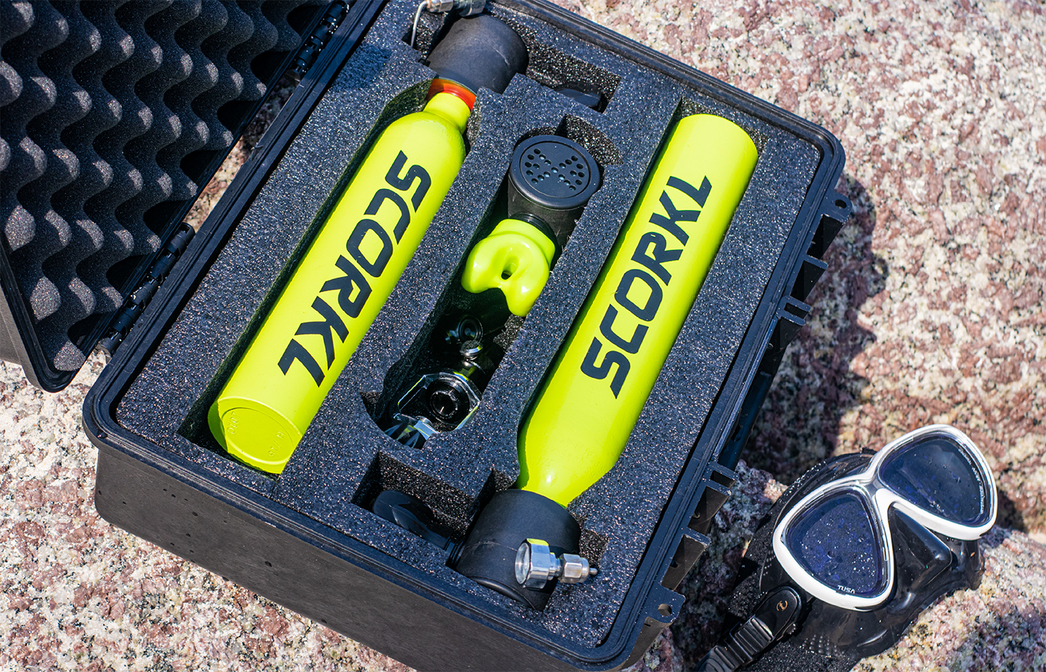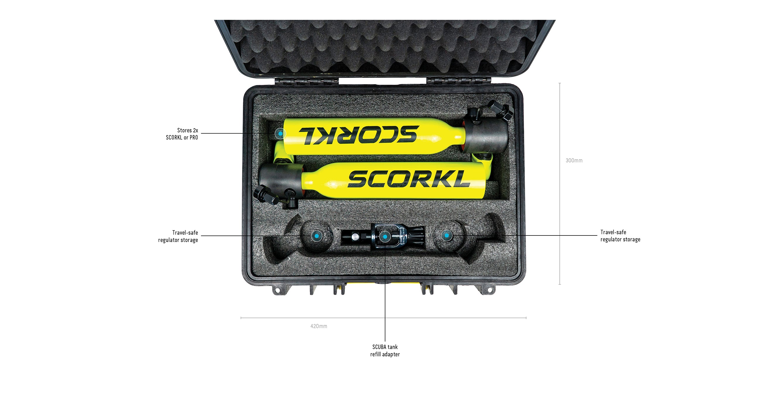 - Includes 2x SCORKL cylinders with regulator, compact case, SCUBA tank refill adapter, compressor refill adapter, protective dust caps, safety instructions and user guide