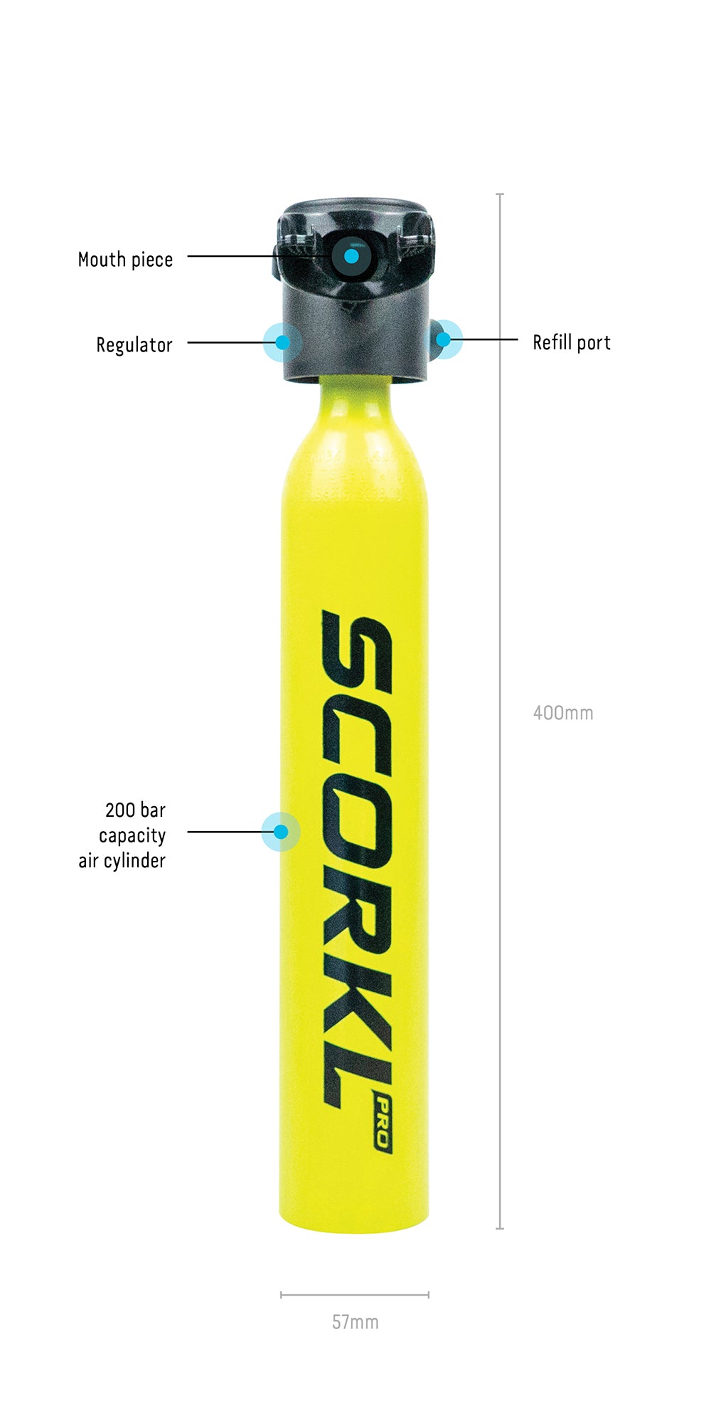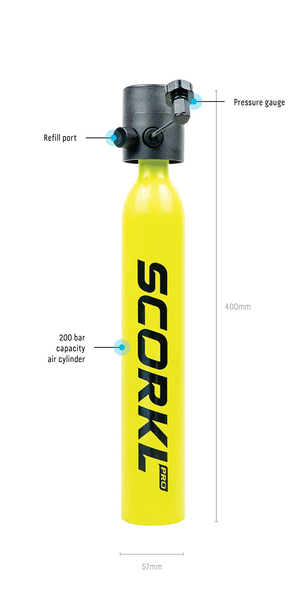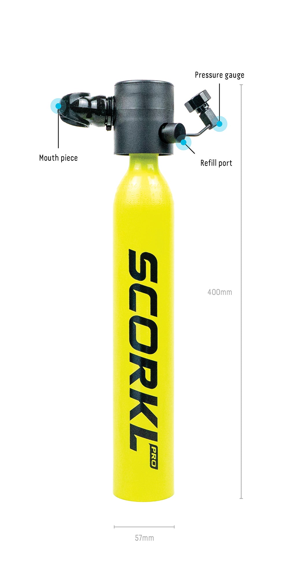 • Includes 10x SCORKL Pro cylinders with regulators, SCUBA tank refill adapter, compressor refill adapter, protective dust caps, safety instructions and user guide