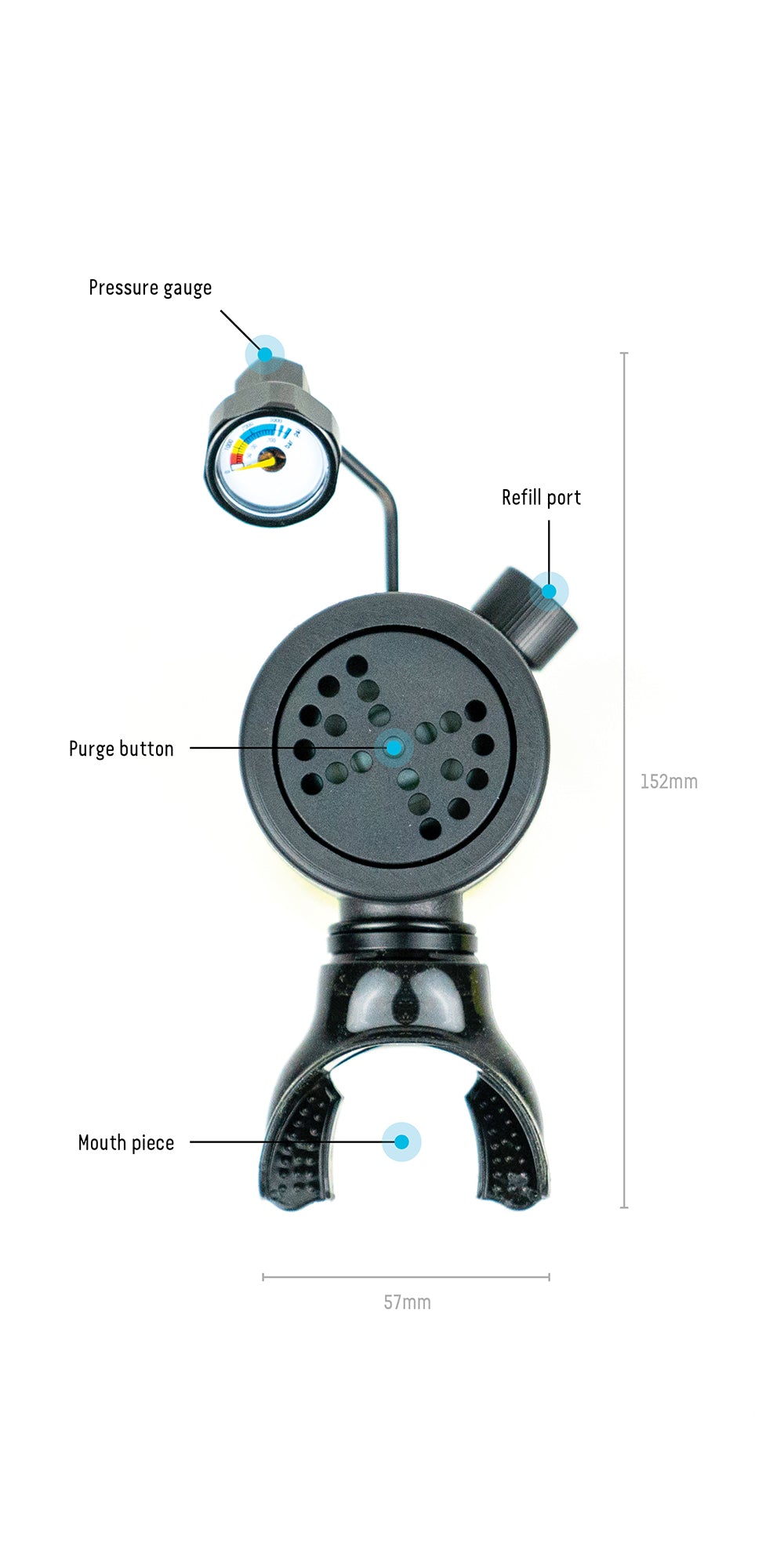 Always-on, breathe on demand balanced single-stage regulator. Pressure gauge tells you how much air is left. The same proven technology trusted by scuba divers all over the world.