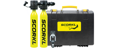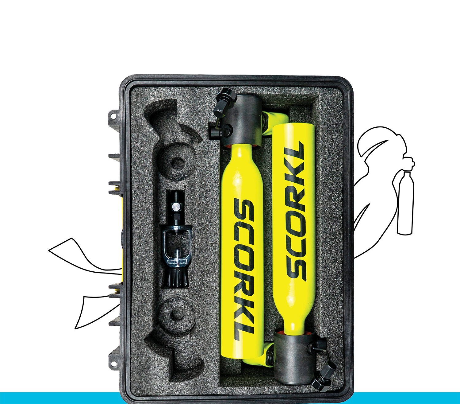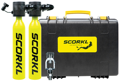 - Includes 2x SCORKL cylinders with regulator, compact case, SCUBA tank refill adapter, compressor refill adapter, protective dust caps, safety instructions and user guide